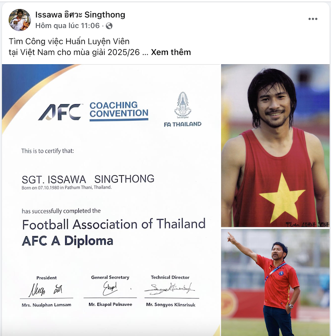 Hôm qua (25/6), cựu tuyển thủ Thái Lan là Isawa Singthong đã đăng trên facebook cá nhân ảnh chụptấm bằng HLV của mình kèmlời nhắn: “Tìm công việc HLV tại Việt Nam cho mùa giải 2025/26” cùng tấm ảnh anh mặc áo cờ đỏ sao vàng lúc còn thi đấu tại Việt Nam và một tấm ảnh Isawa đang chỉ đạo một trận đấu trên sân. Lời xin việc của chàng cựu tuyển thủ xứ Chùa vàng đã nhận được sự cộng hưởng lớn từ cộng đồng mạng.